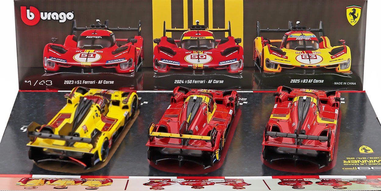 BURAGO - 1/43 - FERRARI - SET 3X 499P WINNER 24h LE MANS TEAM AF CORSE FERRARI - N 83 2025 - N 50 2024 - N 51 2023 - YELLOW RED