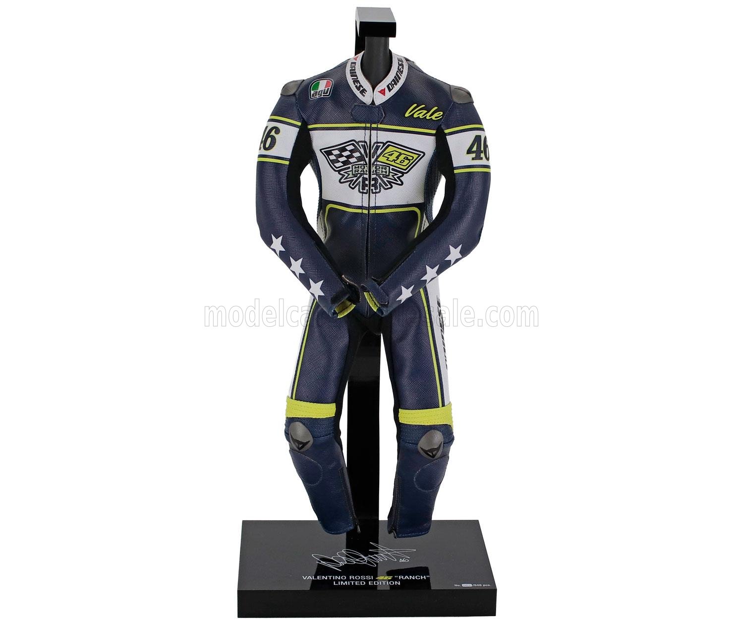 MICROART RACING - 1/4 - DAINESE - RACING SUIT - TUTA - VALENTINO ROSSI RANCH TAVULLIA - TRUE TO ORIGINAL WITH ZIP CLOSURE (RACING SUIT - TUTA - ALTEZZA HEIGHT cm 35.6 - ALTEZZA SUPPORTO - SUPPORT HEIGHT cm 41.2) - BLUE WHITE